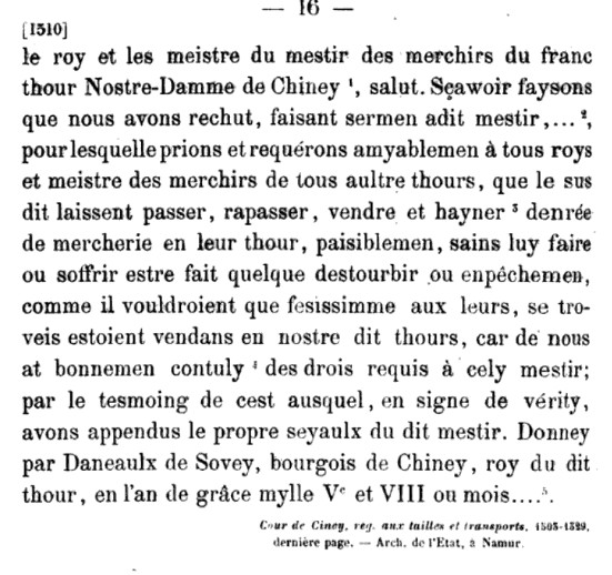 DONNÉ PAR DANEAULT DE SOVET, BOURGEOIS DE CHINEY, ROY DU FRANC THOUR EN L'AN DE GRACE MIL CINQ CENT ET TROIS ».