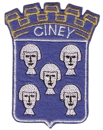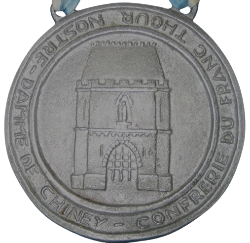 ruban bicolore, la médaille en étain reproduisant les anciennes armoiries de la cité avec porte et potale dédiée à Notre-Dame et qui symbolisait Ciney, "Clé et Porte par